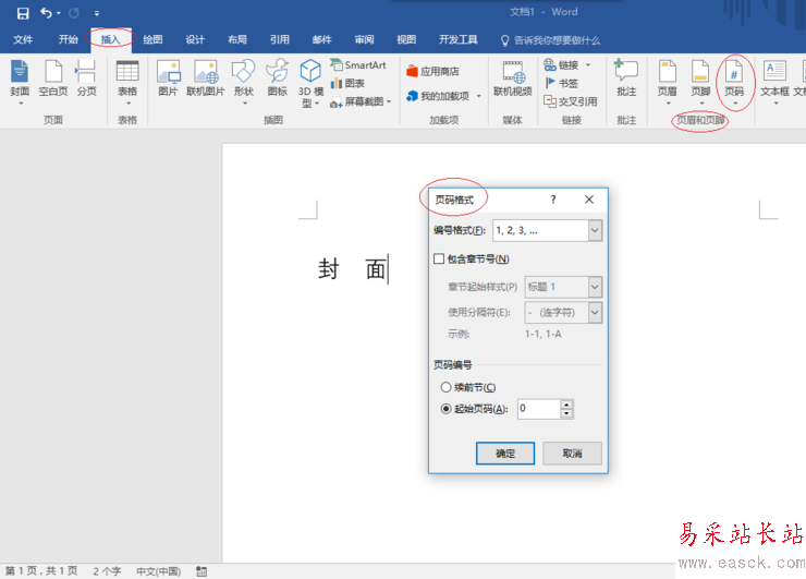 3、喚出"頁(yè)碼格式"對(duì)話框,將"頁(yè)碼編號(hào)→起始頁(yè)碼"設(shè)置為0,點(diǎn)擊"確定"。設(shè)置為0的目的是為了封面不顯示頁(yè)碼做準(zhǔn)備。