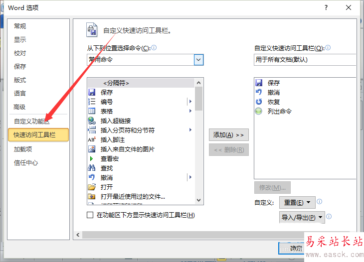 5、在彈出的“Word選項(xiàng)”對(duì)話框中,選擇并點(diǎn)擊“快速訪問工具欄”選項(xiàng)卡欄。如圖所示;