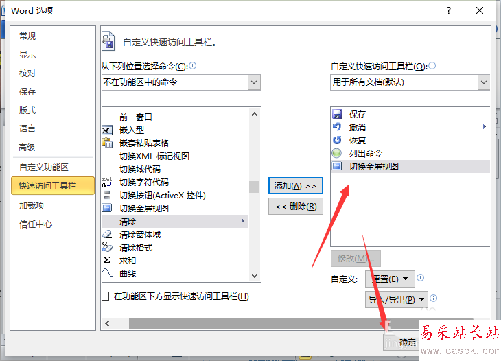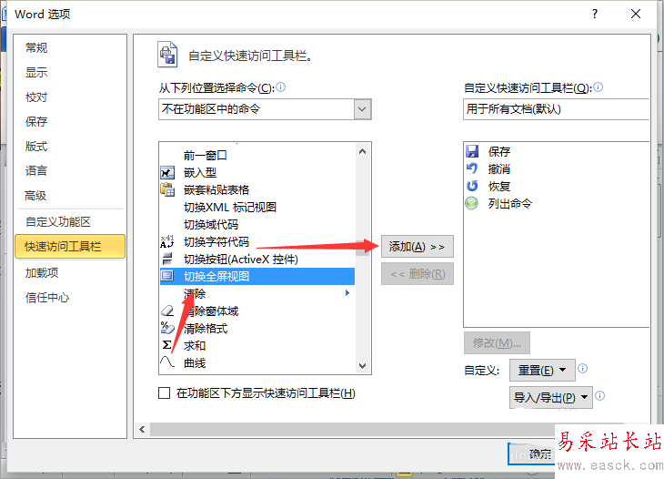 6、在“快速訪問工具欄”選項(xiàng)卡的右側(cè)窗格中,在“從下列位置選擇命令”中選擇“不在功能區(qū)的命令”,再將“切換全屏視圖”添加到“自定義快速訪問工具欄”。如圖所示;