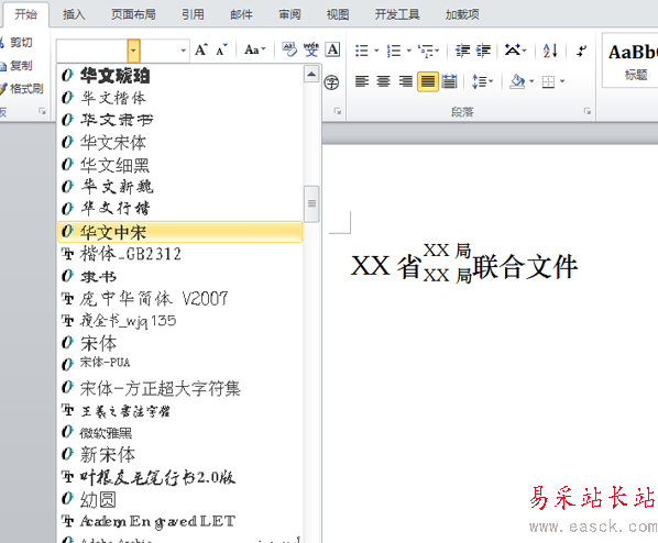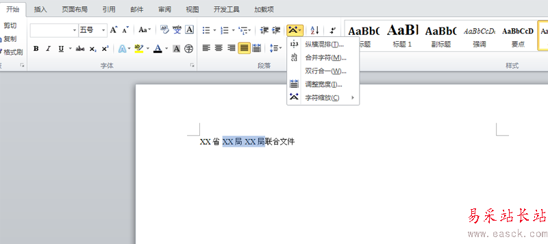 2、選擇中間的XX局文字,執行開始-中文板式命令,彈出下拉菜單。