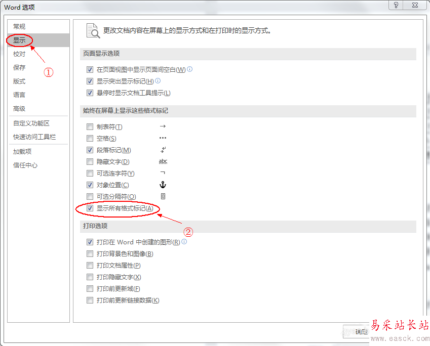3、進入“選項”菜單,先單擊“顯示”菜單,會出現如下界面,再點擊“顯示所有格式標記(A)”選項前的小方格,選定后確定即可顯示所有分頁符。
