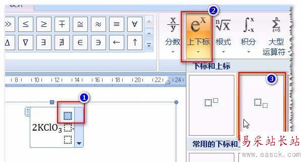4、現(xiàn)在我們要做的就是分析反應(yīng)方程式構(gòu)成,再看公式中能提供模板進(jìn)行設(shè)計(jì)。本例子中的方程式由四個(gè)模板構(gòu)成:第一個(gè),含有下標(biāo)的化學(xué)式;第二個(gè),分上中下三部分的矩陣;第三個(gè)也是含有下標(biāo)的模板,最后一個(gè)是個(gè)向上的箭頭,直接輸入即可。一個(gè)一個(gè)來,先插入一個(gè)下標(biāo)模板, 輸入2KClO, 在下標(biāo)位置輸入3。如圖。