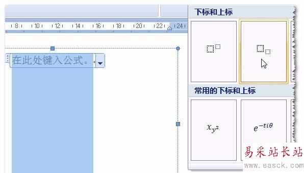 5、完成了第一個(gè)部件,到第二個(gè)了。按一下鍵盤向右的箭頭,使編輯光標(biāo)在第一模板右邊。細(xì)看,這是一個(gè)含有上中下三個(gè)位置的矩陣。所以,在“矩陣”命令中選擇對(duì)應(yīng)的矩模板。