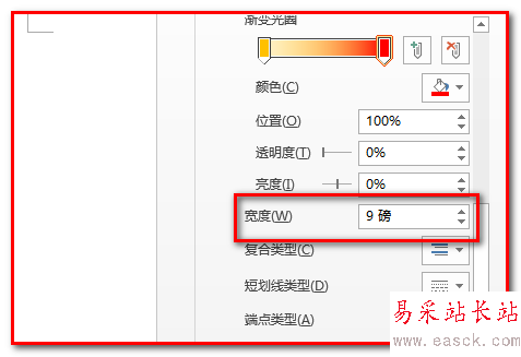 4、下方彈出設置漸變邊框的各項;現在設置漸變的顏色,比如,設置圖片邊框漸變顏色為淡黃到紅的漸變,鼠標點漸變光圈的左邊色塊,選擇黃顏色,