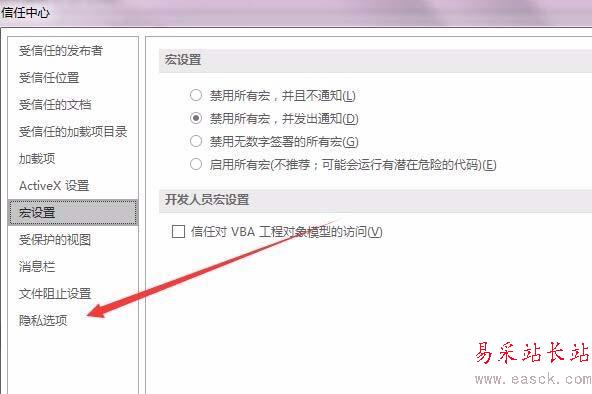 5、在打開的信任中心窗口中,點擊左側的“隱私選項”快捷鏈接