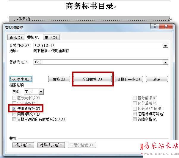 3、勾選使用通配符,點(diǎn)擊全部替換,此時(shí)會(huì)給你所選定的這一列頁碼全部加上括號(hào)。也可以選擇查找下一處依次選擇需要替換的地方,這樣可以避免把目錄文字里面的數(shù)字也加上了括號(hào)。