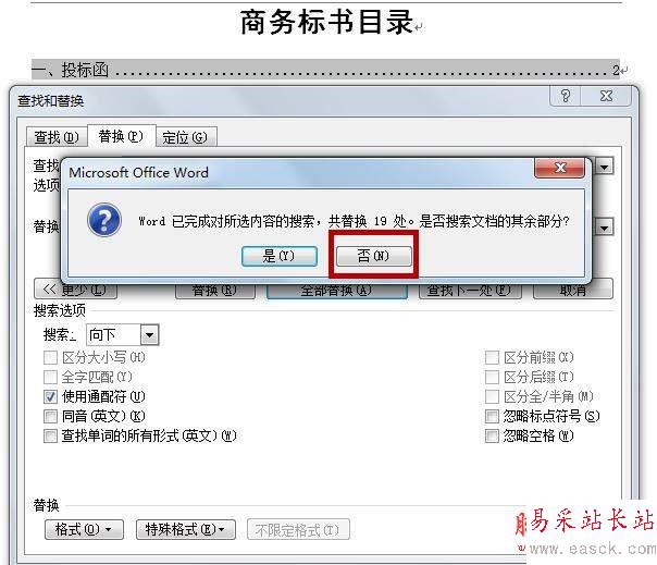 4、替換完后會(huì)顯示已替換所選擇目錄內(nèi)頁碼已加括號(hào)的數(shù)量,點(diǎn)擊否。若點(diǎn)擊是,文檔將繼續(xù)搜索整個(gè)文檔內(nèi)容,使文檔內(nèi)所有數(shù)字都加上了括號(hào)。