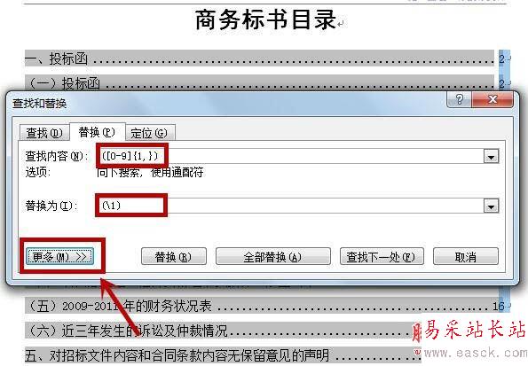 2、按住Alt鍵移動(dòng)鼠標(biāo)選擇要加括號(hào)的頁碼這一列,然后按Ctrl+H,彈出替換的窗口,在查找內(nèi)容欄輸入([0-9]{1,}),在替換欄里輸入(/1),點(diǎn)擊下面的更多按鈕。