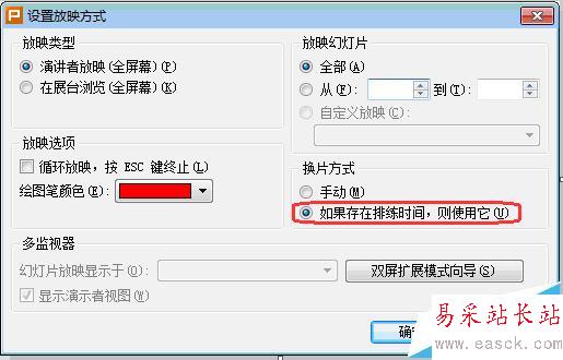 4、排練完成后,就該設置方法方式了。左鍵單擊“幻燈片放映”,選擇“設置放映方式”按鈕。這時會彈出如下圖所示的窗口。在下圖選擇“如果存在排練時間,則使用它”,如下圖紅圈所示。點擊“確定”。