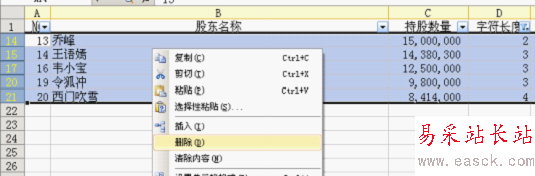 表格僅顯示“股東名稱”字符長度小于或等于4的記錄,刪除之。