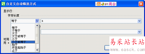 “自定義自動篩選方式”對話框彈出,選中“字符長度”小于或等于4,確定。