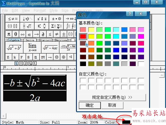 只要在編輯公式時選中編輯好的公式,然后雙擊下方狀態欄上“Color”右側的色塊,就會彈出“顏色”對話框,指定需要的顏色,如圖3所示。然后確定就可以了。