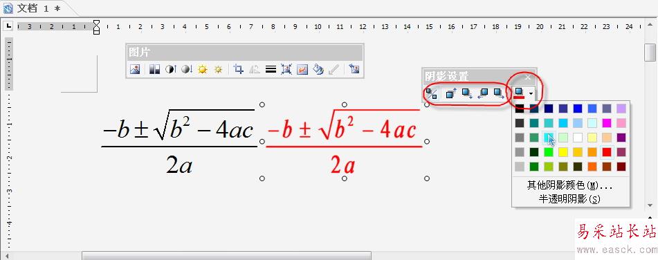 色及陰影的顏色都會變成所指定的顏色。我們再點擊“陰影設置”工具欄上“略向上移”、“略向下移”、“略向左移”和“略向右移”等按鈕,使公式的陰影與公式本身恰好重合,就可以得到指定顏色的公式了。圖2紅色公式即為完成后的效果圖。
