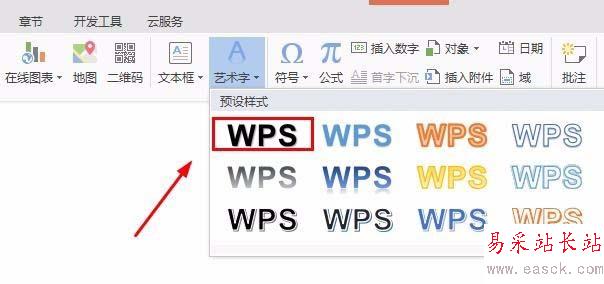 4、點擊藝術文字選項,在其子級菜單里選擇一種樣式,如圖所示: