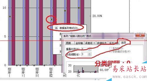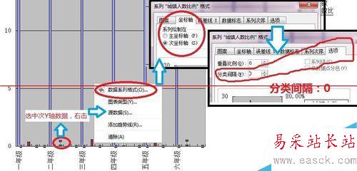4、選中→主Y軸數(shù)據(jù)→右擊→數(shù)據(jù)系列格式→選項→分類間隔:0
