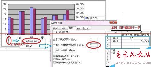 5、部分圖表成圖后,X軸文字顯示異常,解決方法:右擊→X軸文字→坐標軸格式→刻度→分類數(shù)(分類軸刻度線標簽之間):4