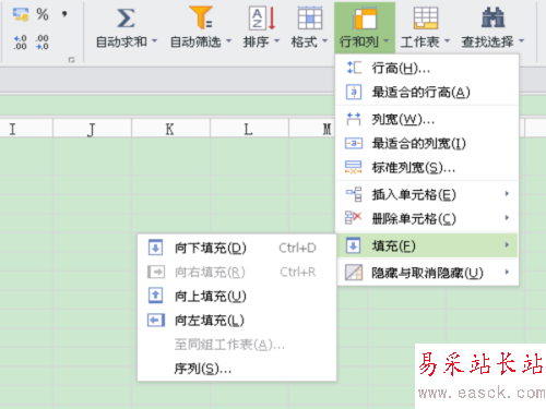 點擊”開始“菜單欄中的”行和列“,選擇”填充“選項中的”向下填充“。