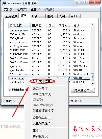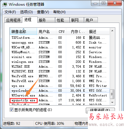 然后依舊在該窗口,我們將應用程序切換至右側的"進程",然后一直往下拉動滾動條,知道我們看到一項映像名稱為"wpsnotify.exe"的程序,如圖,這就是導致每天新聞彈窗的"罪魁禍首"
