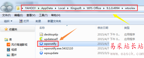 找到之后我們將其刪除掉,然后新建一個名為"wpsnotify.exe”的空白文檔,win7的朋友要注意,一定要將文件的后綴改為".exe",否則就是文本文檔的格式,改完之后就是一個應用程序的格式了,如圖,因為這是我們自行建立的,所以以后就不會再彈出新聞熱點了,大家可以去試試哦