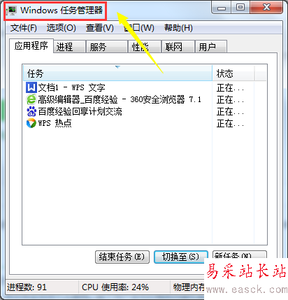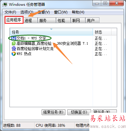 在任務管理器窗口的"應用程序"下,我們一定要確保此時WPS軟件正在運行,從下圖可以看出我們目前正在運行的軟件