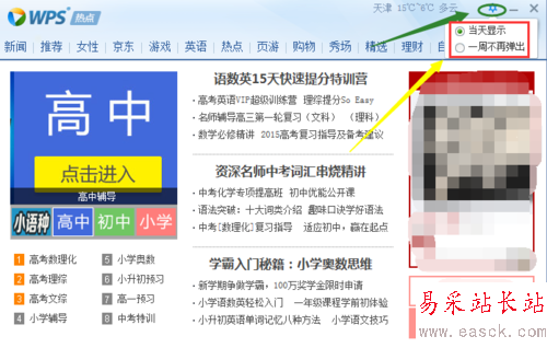 以下是wps每天都會彈出的新聞熱點窗口,相信很多人對它并不陌生吧,在該窗口的右上角有一個設置圖標,點擊之后可以設置該窗口為"當天顯示"或者"一周不再彈出",如下圖,也就是說我們最多只能設置一個星期的不彈出顯示,一周以后又要如此操作才可以
