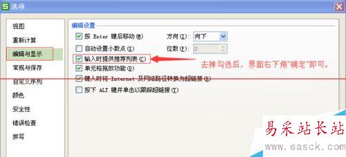 2、編輯與顯示---輸入時提供推薦列表(勾選去掉)---確定。