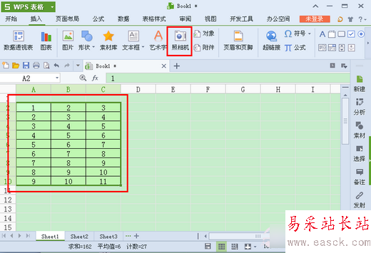 一、我們先在表格中建立一個數據區域并選定,然后點擊”插入“選擇打開“照相機”如下圖。