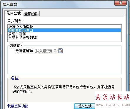 3、在“常用公式”標簽中選擇“提取身份證生日”,單擊進入“參數輸入”下面的“身份證號碼”右側的輸入框,單擊身份證號所在的單元格或直接輸入身份證號所在的單元格名稱,單擊“插入公式”,一個出生日期便提取成功;