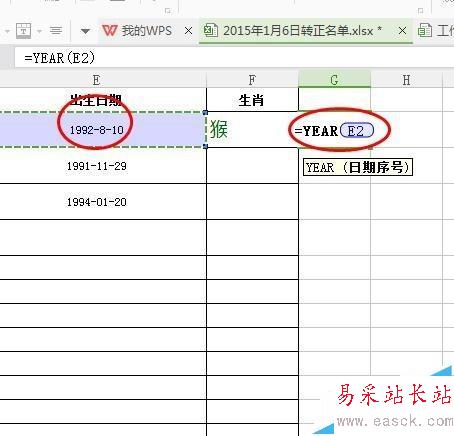 7、如下圖所示的是第一個是生肖用雙引號框住,第二個是公式E2指的是出生日期那一欄,也是取出生肖的開始位置。