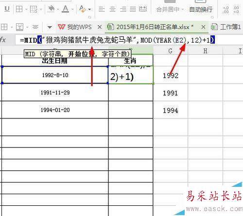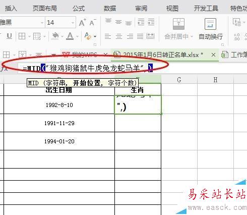 8、最后我們在看輸入的是我么要取出多少個,我們應(yīng)該取得的一個,因為人的生肖就是一個。公式:=MID("猴雞狗豬鼠牛虎兔龍蛇馬羊",MOD(YEAR(E2),12)+1,1)