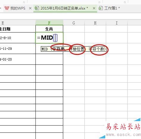 2、我們再在F這一欄也就是生肖這個列,我們先輸入=mid()函數(shù)。這個函數(shù)的意思的引用一個字符串我們從第幾個開始選擇幾個。