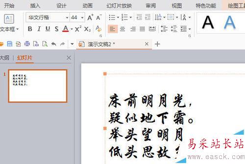 2、在文本框里,輸入一首古詩(shī)。字號(hào)44,字體華文行楷。注意要輸入標(biāo)點(diǎn),否則朗讀就不會(huì)停頓,像流水賬一樣哦。