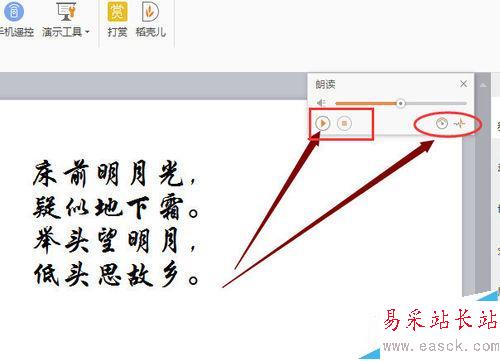 7、工具欄有播放按鈕三角形,停止按鈕正方形,還有語速和語調(diào)設(shè)置按鈕,你可以適當(dāng)調(diào)整,進(jìn)行朗讀播放。當(dāng)然嘍,你還可以利用操作系統(tǒng)的錄音工具把語音錄制下來,插入幻燈片使用。