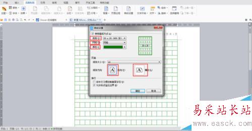 2、彈開“稿紙設置”的子菜單后進行相應設置。在“使用稿紙方式(A)”的地方打上勾,然后對“規格”"網格“”顏色““方向”進行設置。最后點擊確定。