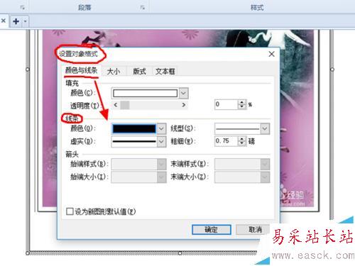 6、修改文本框的屬性。將鼠標放置在文本框線條中,選中之后右擊,彈出一個對話框,選擇下方的“設(shè)置對象格式”,在該界面中的“顏色與線條”中選擇“線條”,將顏色改成“無顏色”即可。