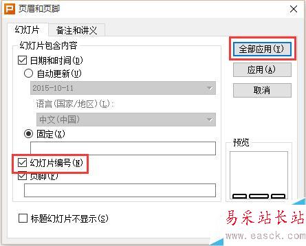 4、勾選幻燈片編號選項,然后點擊右上方的【全部應用】按鈕,點擊全部應用按鈕可以給該PPT內所有的幻燈片添加頁碼,如果點擊【應用】按鈕,只會給選定的幻燈片添加頁碼,這點需要大家注意一下。