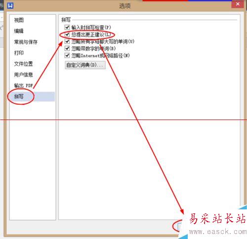 3、在【選項(xiàng)】界面下,點(diǎn)擊選擇【拼寫】--勾選【總是提出更正建議】--【確定】選項(xiàng)完成設(shè)置。(如圖所示)