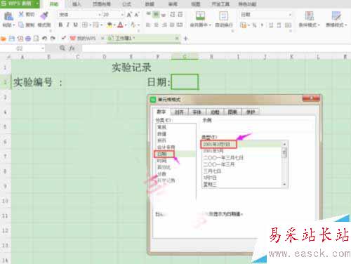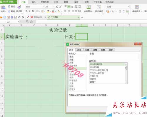 4、在“設置單元格格式”的頁面菜單中我們找到“數字”選項,并點擊它,在它的下拉菜單中找到“日期”并點擊它,在“日期的類型”中我們選擇最上面“2001年3月7日”這個格式,如圖所示,點擊“確定”即可,