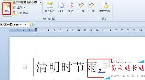 3、比如還是上篇文字,我們想對(duì)他進(jìn)行修訂,先點(diǎn)擊修訂選項(xiàng),我們可以看到我們加入的逗號(hào)是其他顏色的(加入字也是)。