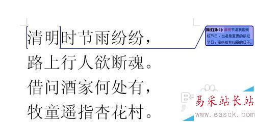 4、點(diǎn)擊插入批注后,就會(huì)跳出批注選擇字頁(yè)面右方(我們剛設(shè)置的),在批注上輸入:清明節(jié)是我國(guó)傳統(tǒng)節(jié)日,也是最重要的祭祀節(jié)日,是祭祖和掃墓的日子。這個(gè)也是根據(jù)自己需求的。