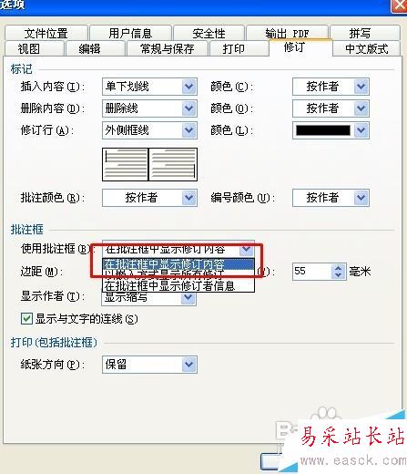 2、選擇修訂選擇中的批注框,使用批注框:選擇在批注框中顯示修訂內(nèi)容。選擇完成后點(diǎn)擊確定。