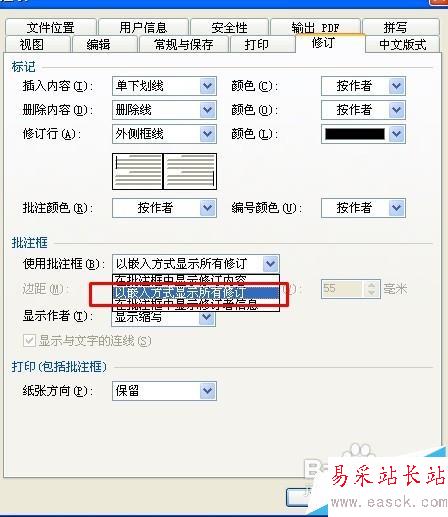 2、選擇修訂選擇中的批注框,使用批注框:選擇以嵌入方式顯示修訂內(nèi)容。選擇完成后點(diǎn)擊確定。