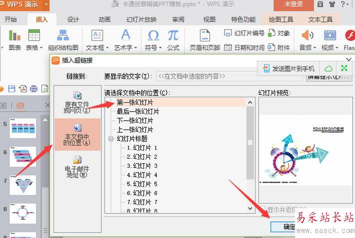 10、在插入超鏈接對話框中,選擇左側(cè)“本文檔中的位置”選項,在請選擇文檔中的位置,選擇”第一張幻燈片“,再點擊“確定”按鈕。這樣在播放幻燈片結(jié)束后跳轉(zhuǎn)到第一張幻燈片上。實現(xiàn)循環(huán)播放。如圖所示;
