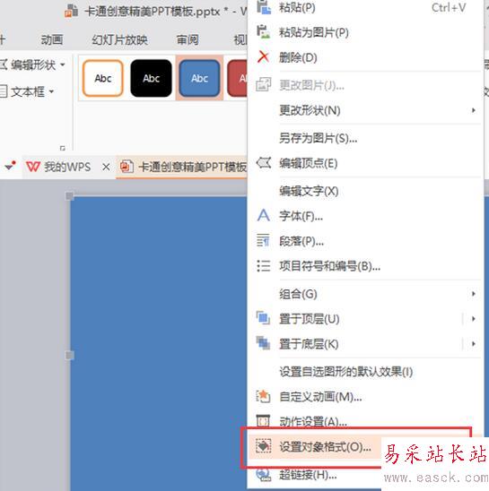 5、圖形畫好以后,將其選中,并點擊鼠標(biāo)右鍵,在彈出的選項框中點擊“設(shè)置對象格式”選項。如圖所示;