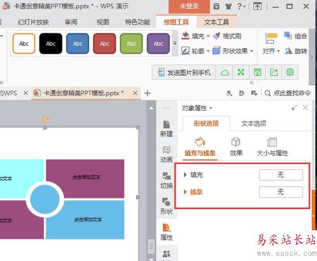 7、在“對象屬性”對話框中,將填充和線條兩個選項都選擇“無”。如圖所示;