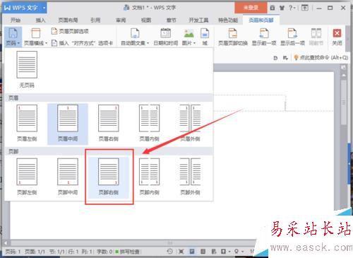 7、在頁碼選項框中,選中頁腳下的“頁腳右側”選項點擊它。如圖所示;