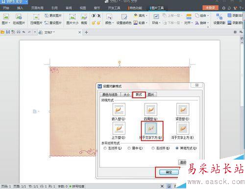 4、選擇【版式】菜單下的【襯于文字下方】,選擇確定