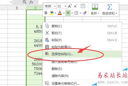 5、選擇需要修改的數(shù)據(jù)單元格,如果數(shù)據(jù)比較多,可以直接點擊列表上方的字母,選擇整列;如果數(shù)據(jù)少,可以直接用鼠標進行拖選。選擇好后,點擊右鍵,在快捷菜單中選擇“選擇性粘貼”。