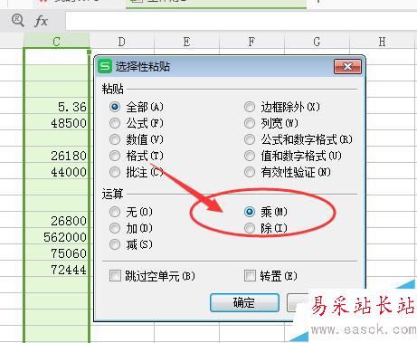 6、在彈出的對話框中,選擇“運算”中的“乘”,然后點擊確定即可。