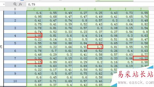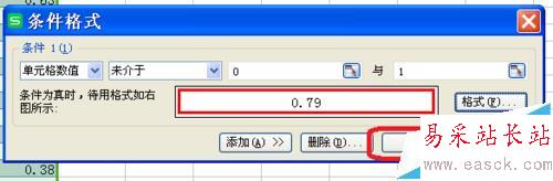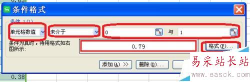 5、返回到條件格式設置,繼續點擊確定(如果需要可點擊“添加”增加其他條件格式)就會處理數據了, 結果如圖所示,所有未介于0~1的數字邊框變紅。